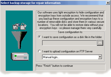 To create files with repair information, use Disaster Recovery Wizard command at the File menu. Choose "I want to save configuration and encryption keys" option and press the Next button. The following page will appear.